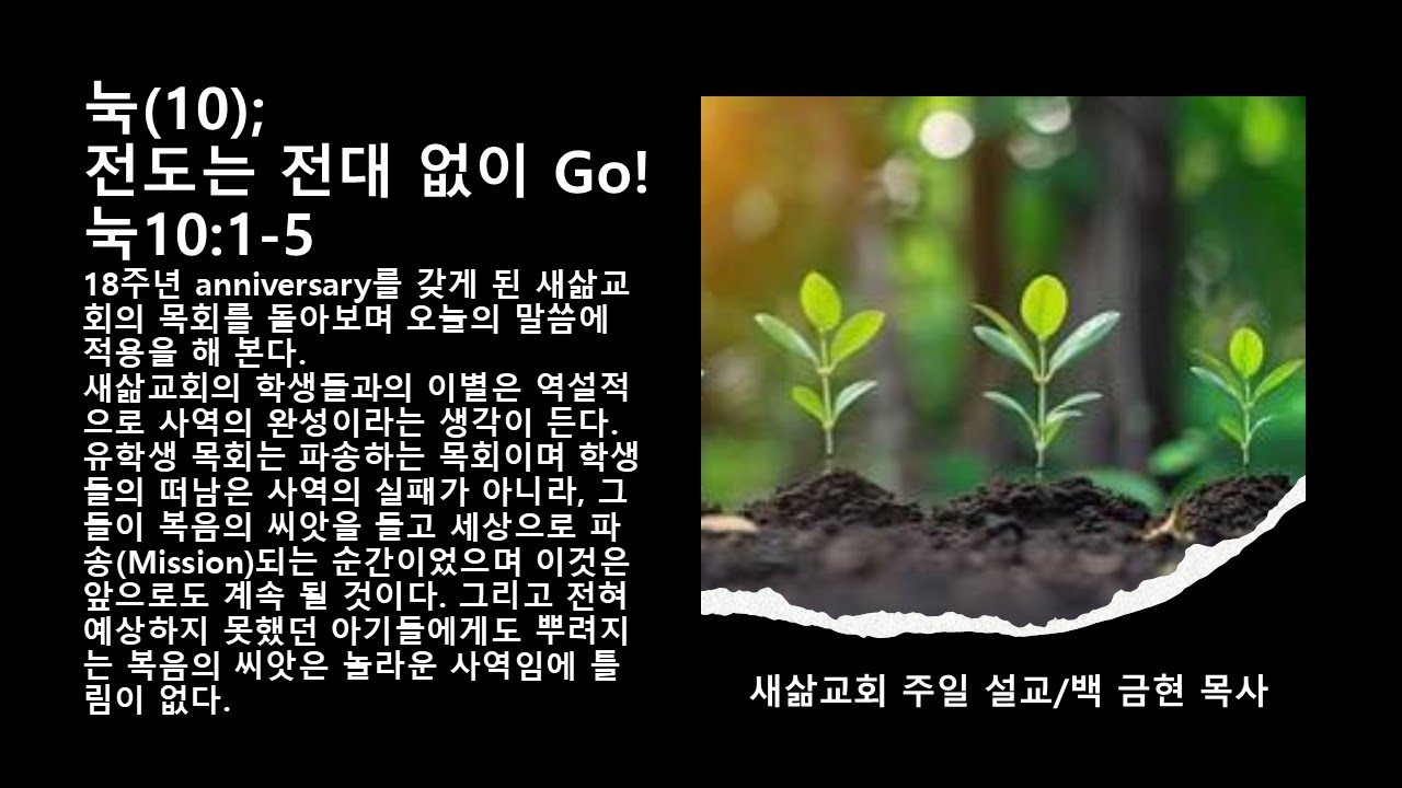 지난 9월, 18주년 Anniversary를 갖게 된 새삶교회의 목회를 돌아보며 오늘의 말씀을 적용해 본다. 새삶교회의 학생들과의 이별은 역설적으로 사역의 완성이라는 생각을 해본다. 유학생 목회는 파송하는 목회이며 학생들의 떠남은 사역의 실패가 아니라 그들이 복음의 씨앗을 들고 세상으로 파송(mission)되는 순간이었으며 이것은 앞으로도 계속될 것이다. 그리고 전혀 예상하지 못했던 아기들의 탄생으로 그들에게 뿌려지는 복음의 씨앗은 놀라운 사역임이 틀림이 없다.