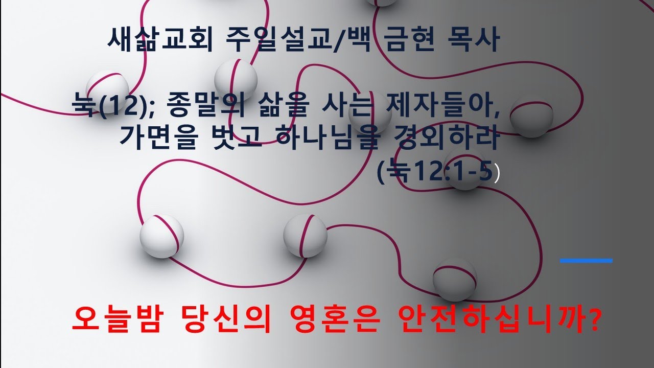 종말의 삶을 사는 제자들에게 예수님께서는 외식하는 신앙생활을 버리라, 참된 부요의 의미를 깨닫고 하나님께 부요한 삶을 살아라 그리고 마지막 오실 주님을 깨어서 기다리라는 말씀을 주셨습니다. 여러분, 지금 하나님 앞에 가면을 쓰고 계십니까? 지금 벗으실 때입니다. 여러분, 하나님께 부요한 삶을 살고 계십니까? 세상에게 부요한 삶을 살고 계십니까? 영적으로 깨어 있습니까? 오늘밤 당신의 영혼은 안전하십니까?